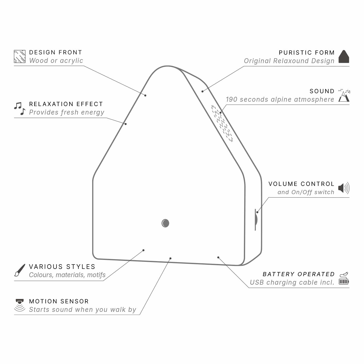 The Heidibox Wit plays the sound of nature from the Alps. The bird sounds and mountain atmosphere create a soothing effect. You immediately feel as if you are hiking in the mountains of Austria.
