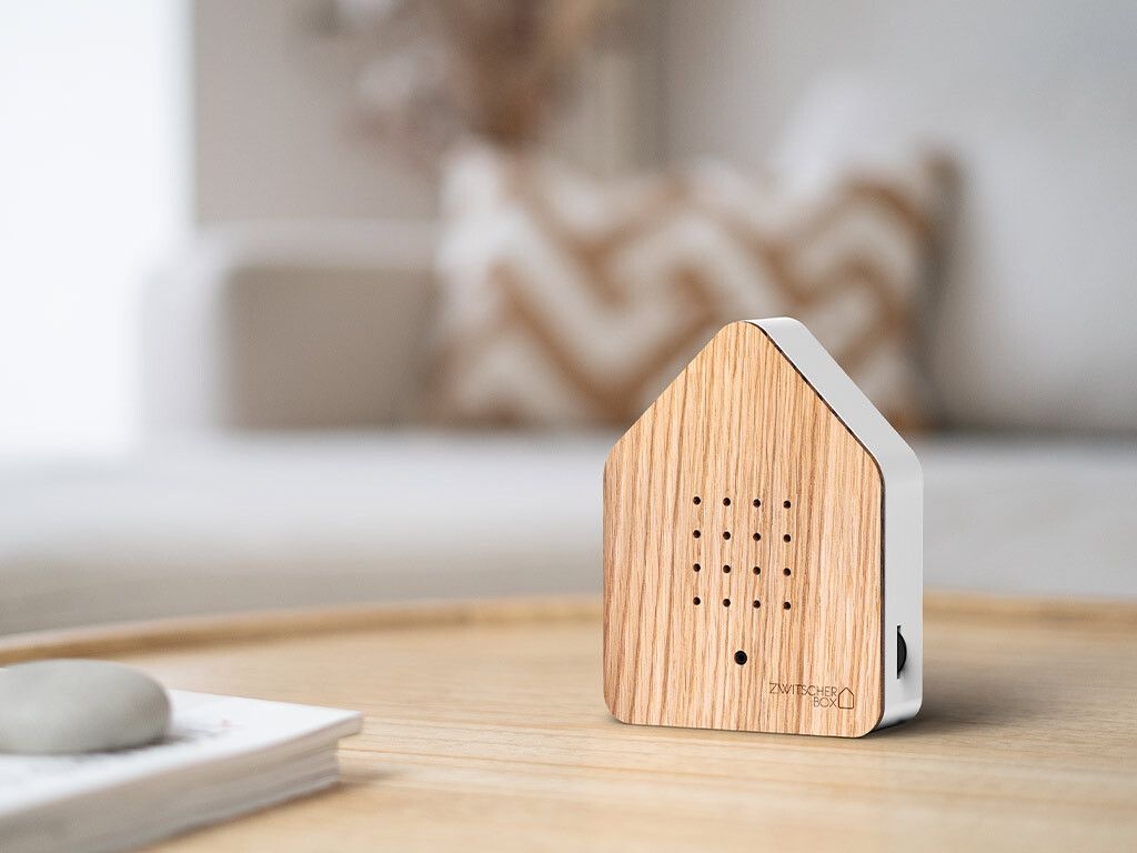 The Zwitscherbox oak white from Relaxound brings peace into your home with a stylish and minimalist design. As soon as you walk by, the device activates relaxing bird sounds that take you to the forest for a moment. An elegant addition to your interior and to your well-being.