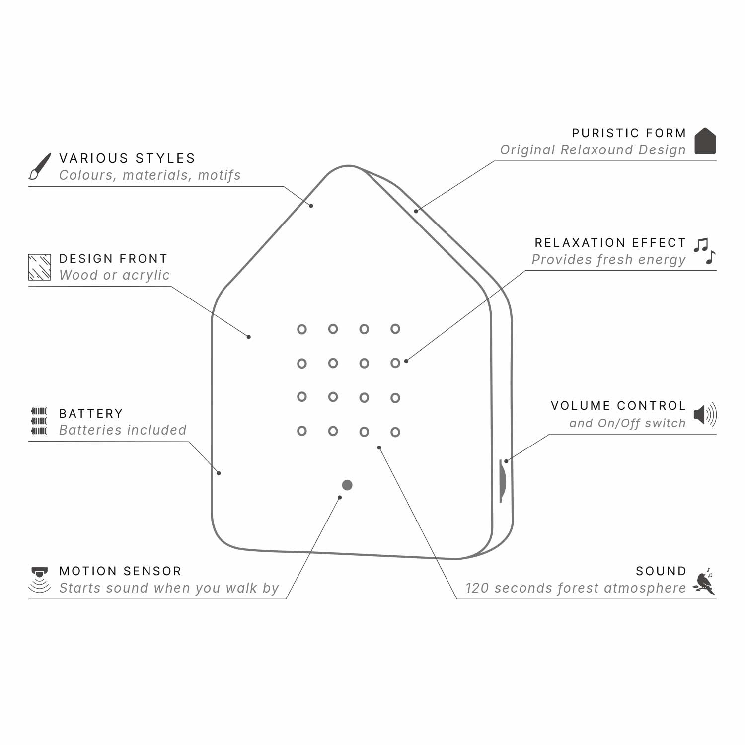 With one movement you activate two minutes of birdsong, recorded in a German forest. These natural sounds help to release tension and come to yourself for a moment. Users describe it as "a mini vacation in your own home" or "a moment of rest in a busy day". Ideal for spaces such as hallway, toilet, study or bedroom.