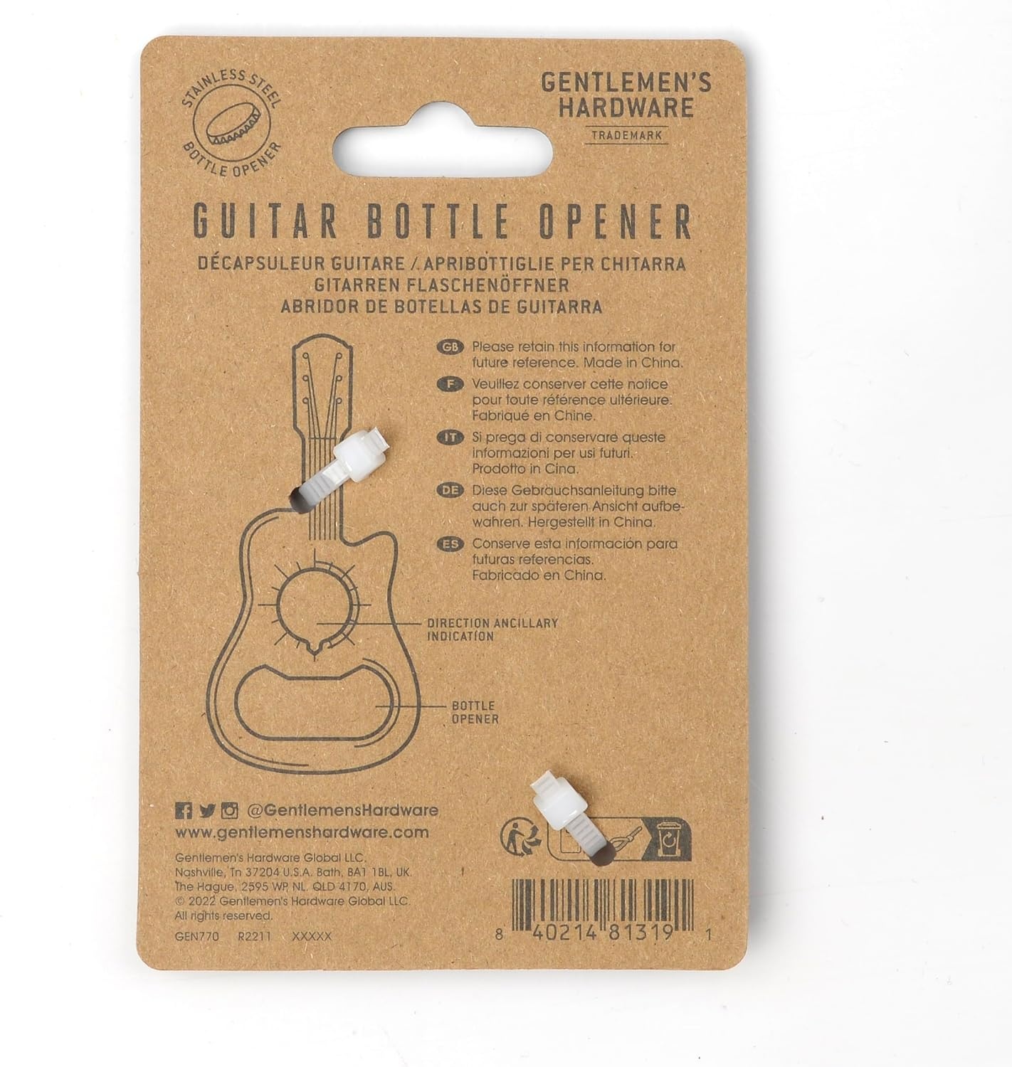 De Gitaar flesopener van Gentlemen's Hardware is de perfecte combinatie van design en functionaliteit. Deze originele flesopener in de vorm van een gitaar is ideaal voor muziekliefhebbers en mannen die houden van stoere accessoires. Een praktisch item met karakter, geschikt voor iedere gelegenheid.